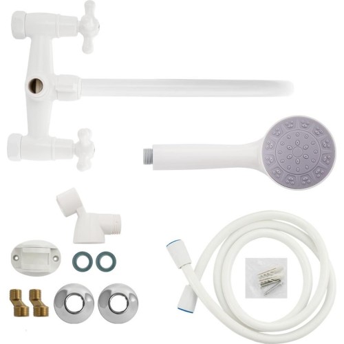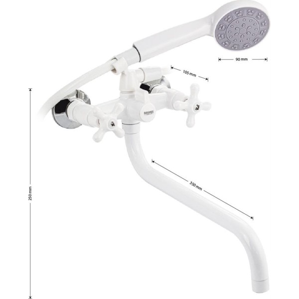 Смеситель из высокопрочного пластика АБС - белый, в ванную/душевую комнату, с длинным, круглым изливом, литой корпус, металлокерамика, с дивертором м/к на корпусе. Материал изготовления — пластик. Кранбуксы металлокерамика 1/2, ручки крест поворот на 90˚, аэратор для экономии воды, чашки и эксцентрики. Габаритные размеры: ширина 150 мм, высота корпуса 250 мм, длина излива 350 мм, душевая лейка d = 90 мм, шланг 150 см, диаметр чашки 65 мм. Вес - 1,12 кг, объём - 0,0045 м3. В комплекте паспорт, корпус с изливом, дивертор, душевая лейка, шланг, кронштейн, комплект крепежа и прокладок.